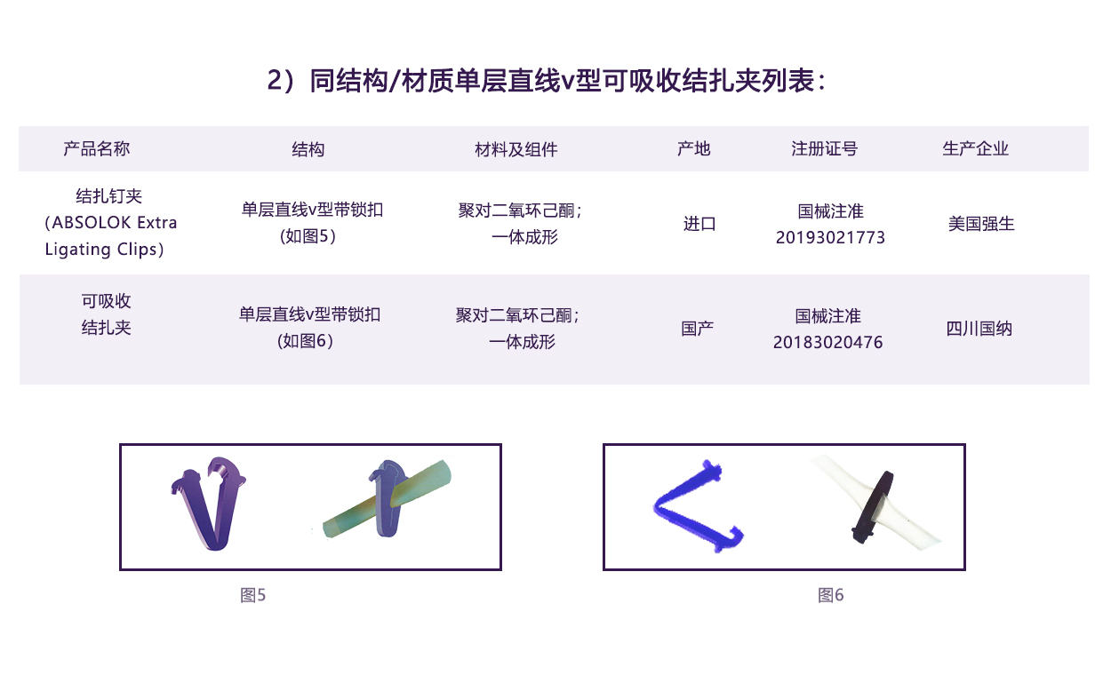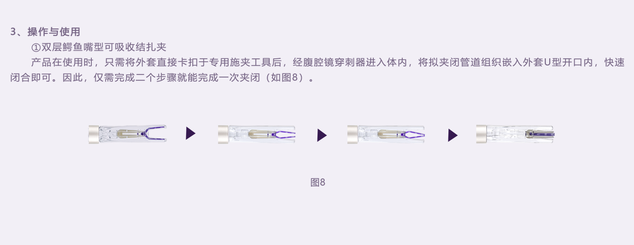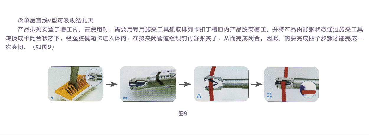 內(nèi)層夾用醫(yī)用染色劑,與進(jìn)口單層V型可吸收夾顏色一致,提高其可視性。